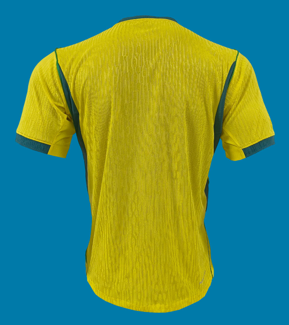 A camisa titular do Brasil trará o novo template da marca americana como base e não terá muitas “invenções”. Nas imagens podemos ver que o amarelo volta a ter um tom mais escuro, após dois modelos mais claros, e tem gola redonda com uma ponta triangular na frente, em verde, num tom mais escuro (Geody Teal), assim como era em 1970, padrão que também será visto nos punhos. Os demais detalhes do modelo, como arcos nas dorsais e finas linhas nos ombros e laterais do corpo, além dos punhos, são verdes (Light Menta). O escudo é aplicado no lado esquerdo no peito, com o Swoosh em verde no lado direito. Dentro da gola, um selo especial traz um losango com a palavra “Vai Brasa”.