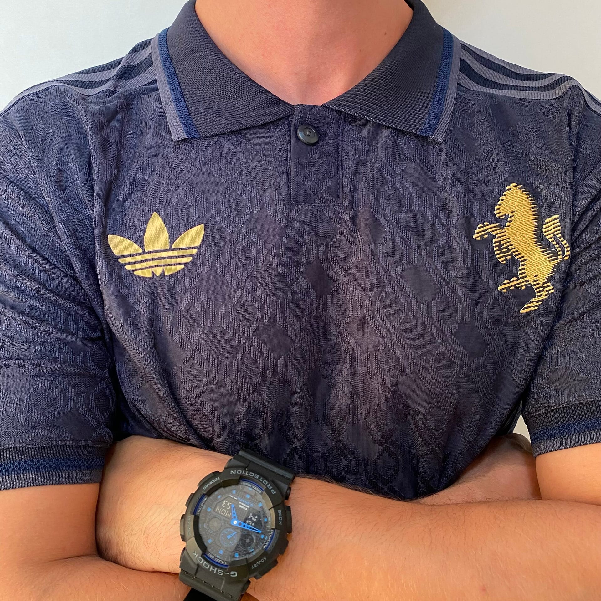 O novo “third kit” da Juventus ganha um tom de cinza chumbo azulado e ganha um padrão gráfico em jacquard que se repete ao longo de todo o corpo do kit. A gola é polo na mesma cor e ganha em frisos dois tons de cinza azulado, mais claros, com este padrão que se repetindo nos punhos. O escudo traz um estilo bem nostálgico ao trazer de volta a zebra, em movimento, na cor dourada, que também é vista no trefoil, além do nome do clube, na nuca.
