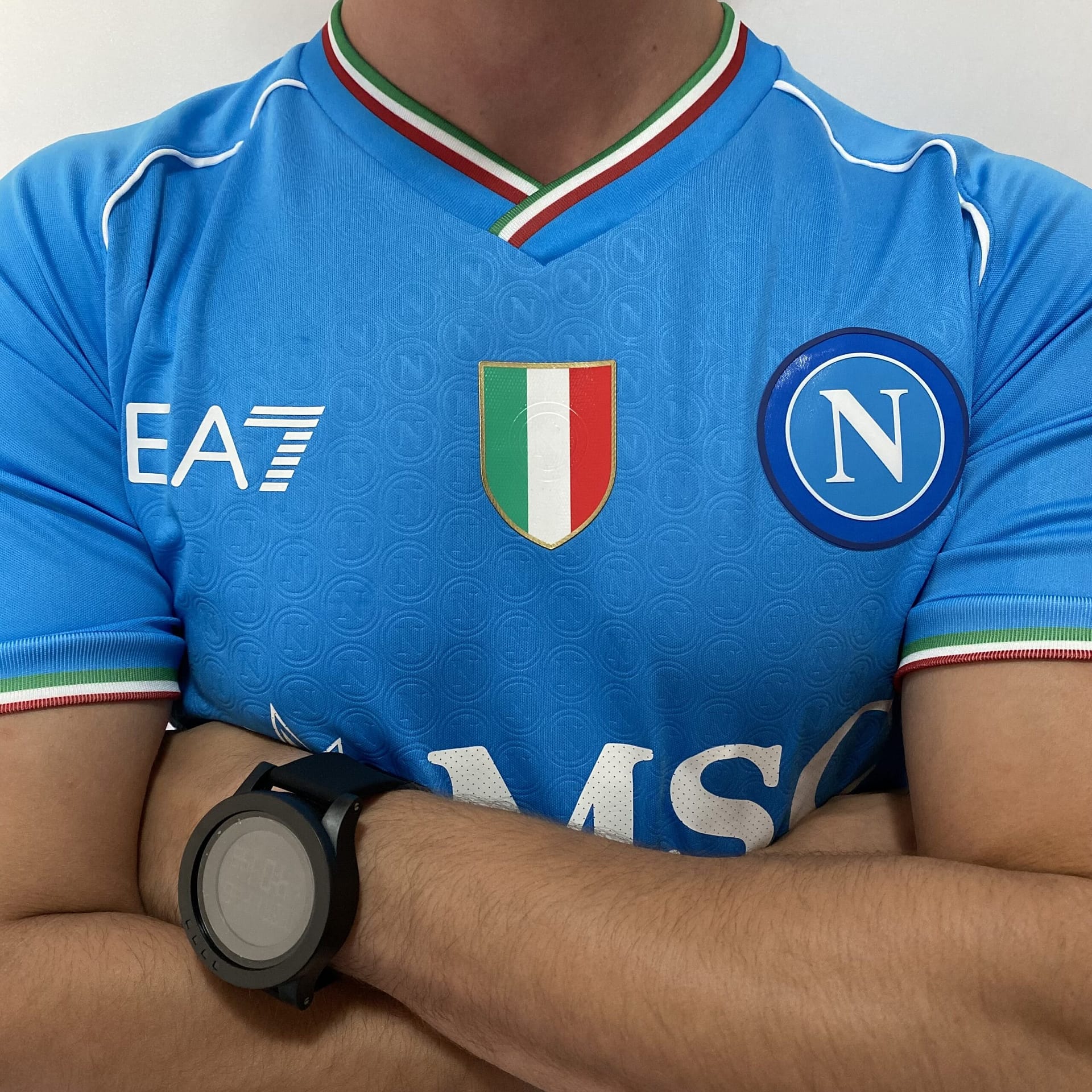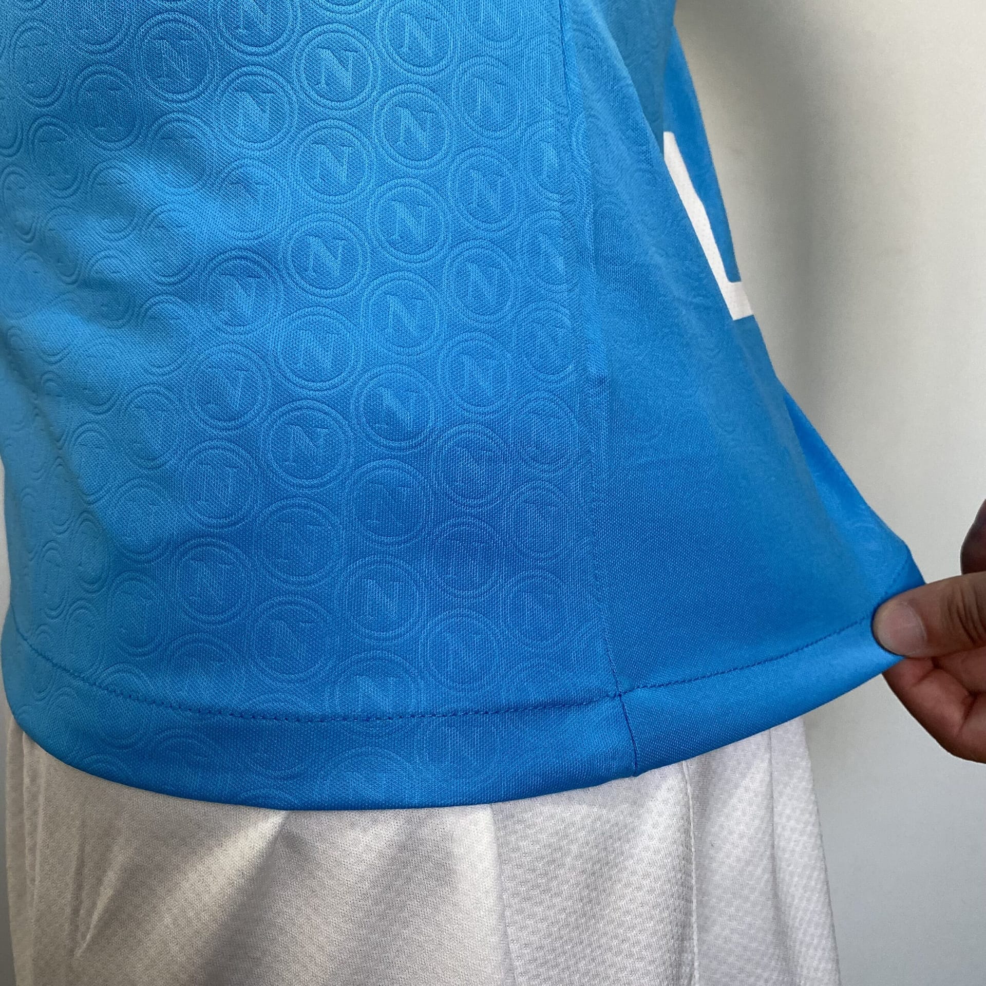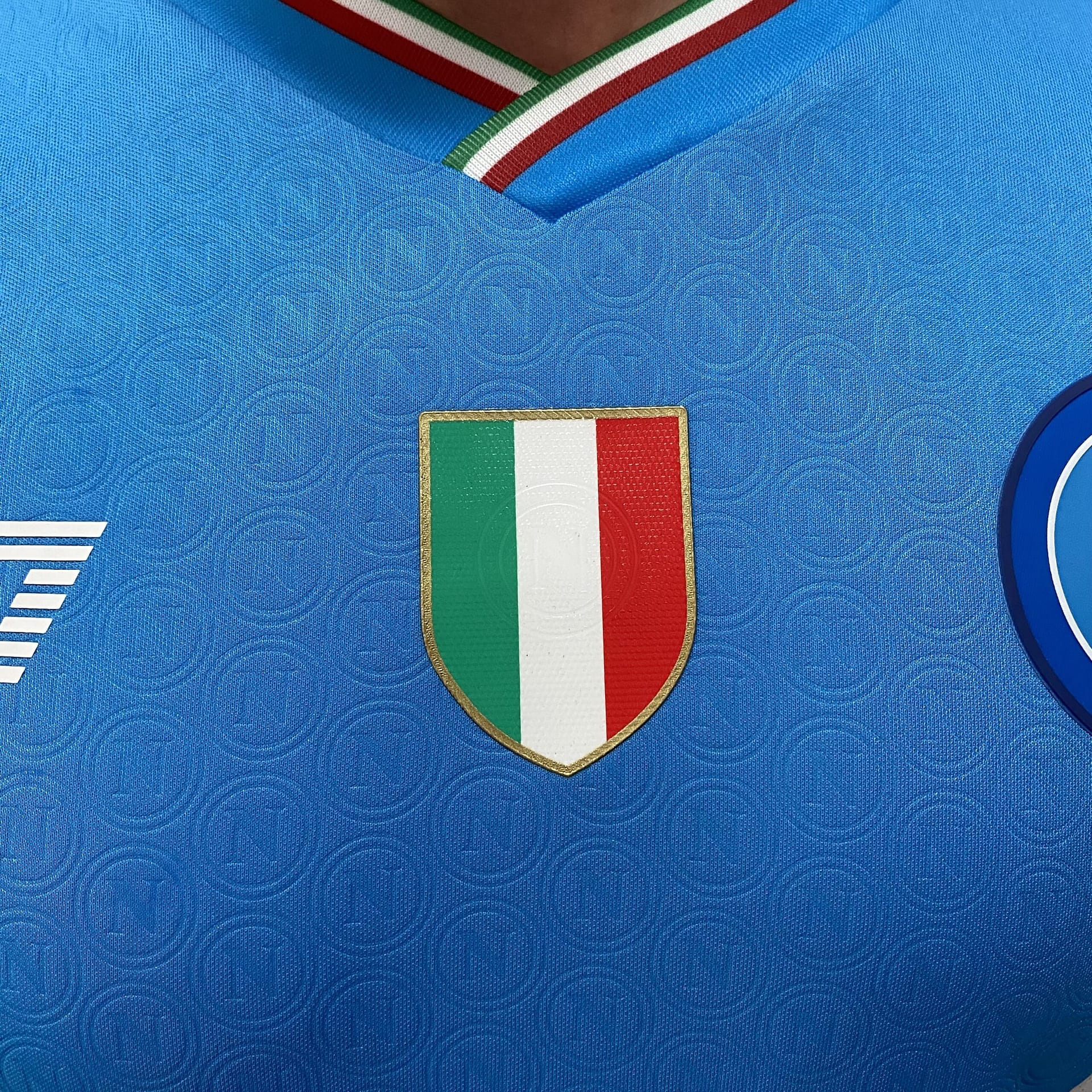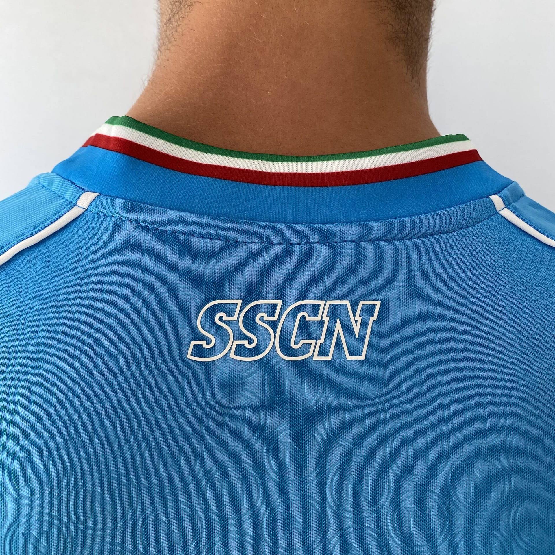 A camisa titular do Napoli é azul celeste e traz ao longo de todo o corpo do manto um pattern que replica o escudo do clube.