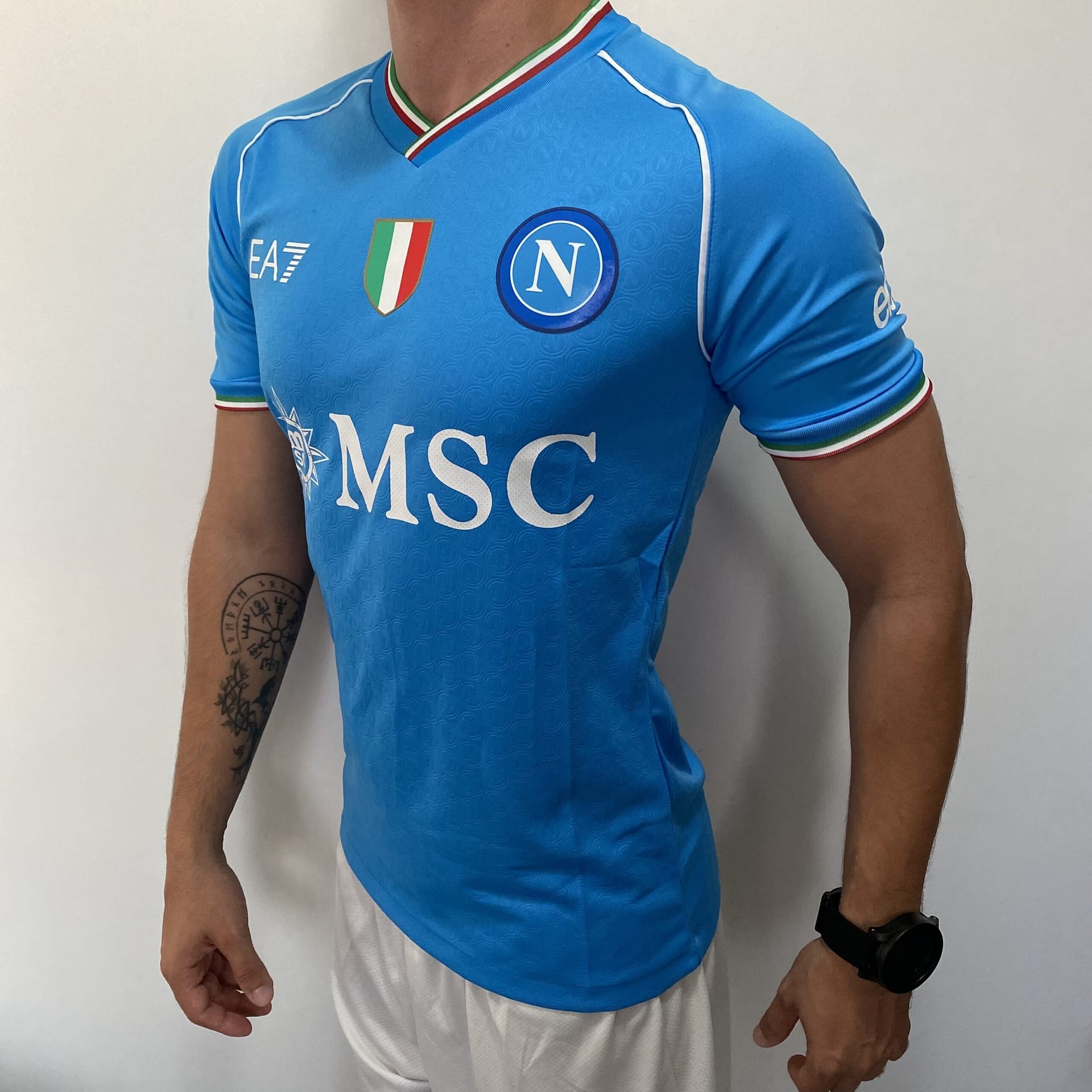 A gola é V e traz o azul celeste junto das cores da bandeira italiana, padrão este que também é repetido nos punhos. Detalhes brancos “recortam” a região do corpo das mangas. O escudo é aplicado no lado esquerdo do peito, enquanto o logo da EA7 aparece em branco no lado direito. Centralizado, será visto o patch de campeão italiano. Já os patrocinadores são brancos. O uniforme para jogos como mandante se completa com calção branco e meiões em azul celeste.