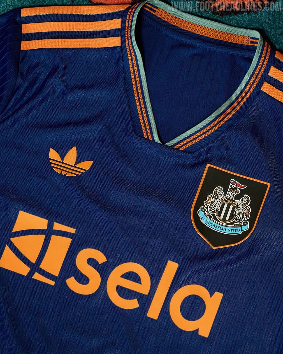 A nova camisa alternativa do Newcastle United traz o azul royal como predominante, num design bem elegante, riscado, trazendo uma releitura do modelo reserva da temporada 1997-1998. As principais referências ao modelo antigo estão presentes na gola EQT e nos punhos, onde estão linhas alaranjadas e turquesa. As três listras são dispostas nos ombros, em laranja, mesma cor do ícone retrô do Newcastle, disposto na nuca, e também do patrocinador máster. A Adidas estampa seu logo Trefoil, da linha Originals, no lado direito do peito, em laranja, enquanto o escudo do Newcastle vai no lado esquerdo, em sua versão atual padrão, dentro de um badge, como em 1998.