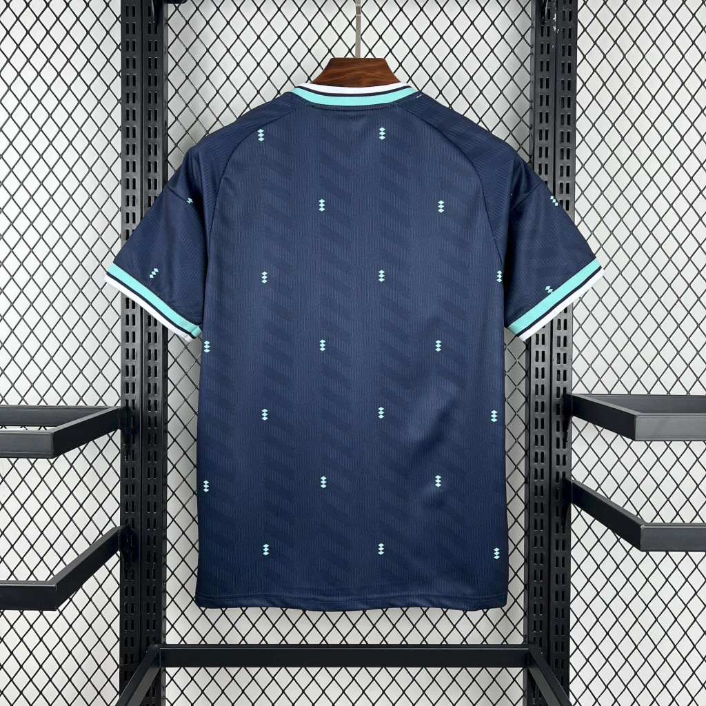 A nova camisa reserva da seleção tetracampeã do mundo deve ter como principal destaque a cor azul como predominante, uma novidade nos mantos de linha, algo que tem ocorrido nos últimos modelos, como o roxo e rosa a Euro 2024. A inspiração ainda não foi revelada. O design em si parece ter bastante inspiração nos modelos verdes utilizados entre 1986 e 1990, com grafismos pelo corpo, neste caso, listras verticais em tons de azul, cobertas com ziguezagues. A gola de formato V e os punhos trazem um estilo raglan, numa pegada retrô, trazendo o branco e o azul celeste, cor que também deve ser utilizada nas três listras da marca e no calção. A adidas deve manter a tendência atual, de utilizar o trefoil nos mantos alternativos, dispondo-o no lado direito do peito, em branco, mesma cor do escudo da seleção, no lado esquerdo, que traz também o azul marinho.