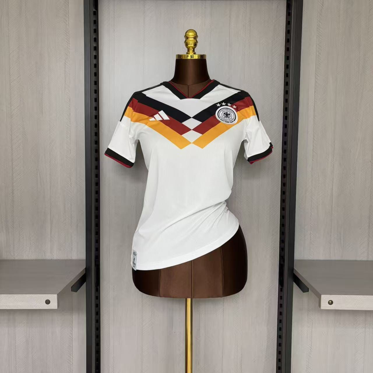 A nova camisa titular da seleção tetracampeã do mundo traz o tradicional branco como cor base e tem como destaque um chevron, que liga as mangas e o peitoral, em três faixas nas cores da bandeira nacional, o que parece ser uma mistura entre os designs dos últimos dois títulos da seleção (1990 e 2014). A gola é preta, com contorno vermelho, assim como os punhos, enquanto que as três listras nas mangas, que mostram uma largura bem maior que o normal, algo que será implantado nos modelos da marca para a temporada 2026-2027, são pretas. A adidas estampa seu logo atual em branco, no lado direito do peito, enquanto o escudo da Seleção Alemã vai no lado esquerdo, em sua versão branca e preta. Na barra, vai uma jocktag especial da marca, com o ano 1954, primeiro título dos germânicos.