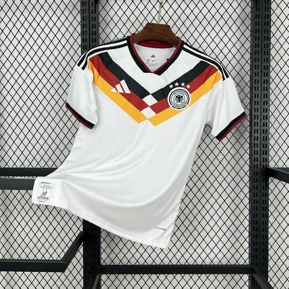 A nova camisa titular da seleção tetracampeã do mundo traz o tradicional branco como cor base e tem como destaque um chevron, que liga as mangas e o peitoral, em três faixas nas cores da bandeira nacional, o que parece ser uma mistura entre os designs dos últimos dois títulos da seleção (1990 e 2014). A gola é preta, com contorno vermelho, assim como os punhos, enquanto que as três listras nas mangas, que mostram uma largura bem maior que o normal, algo que será implantado nos modelos da marca para a temporada 2026-2027, são pretas. A adidas estampa seu logo atual em branco, no lado direito do peito, enquanto o escudo da Seleção Alemã vai no lado esquerdo, em sua versão branca e preta. Na barra, vai uma jocktag especial da marca, com o ano 1954, primeiro título dos germânicos.