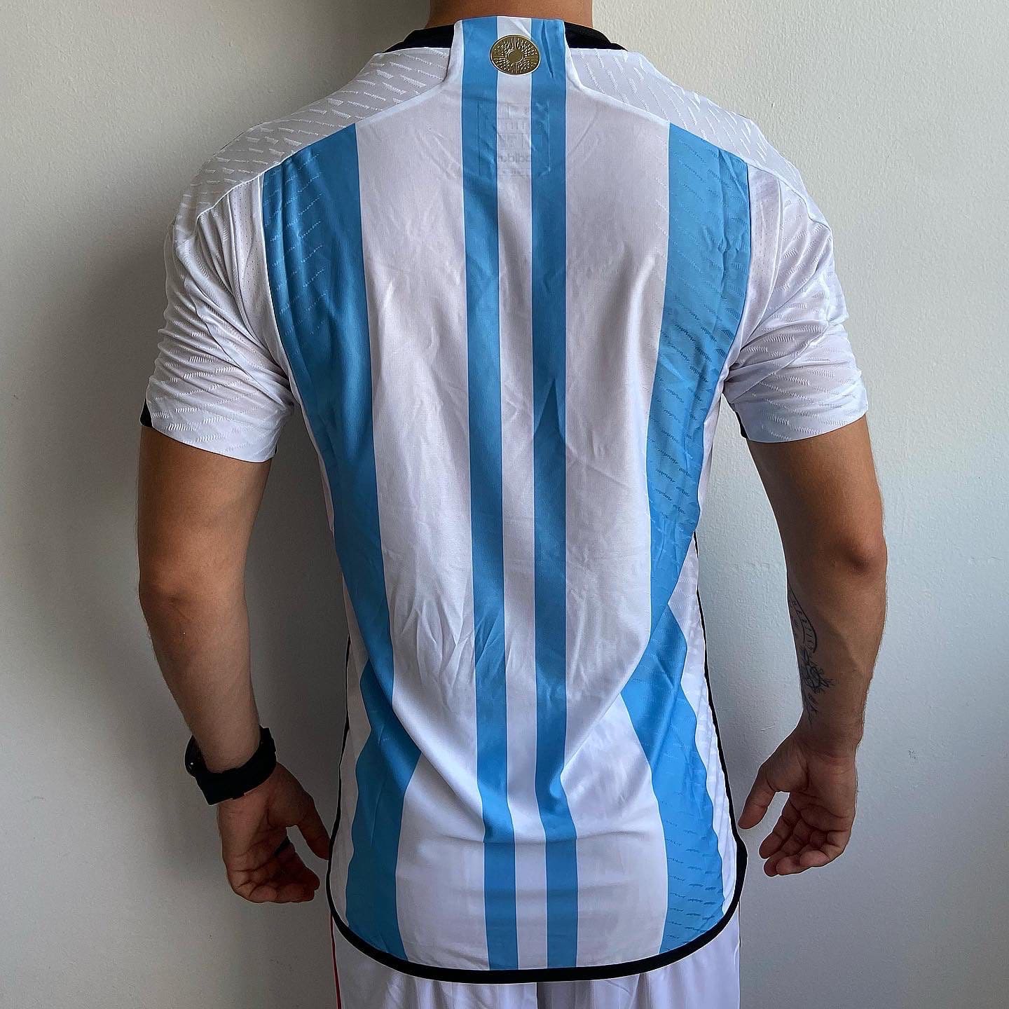 A incrível e histórica camisa da Argentina que foi usada na conquista do Tri Mundial no Catar (exatamente o mesmo modelo usado na final contra a França).
