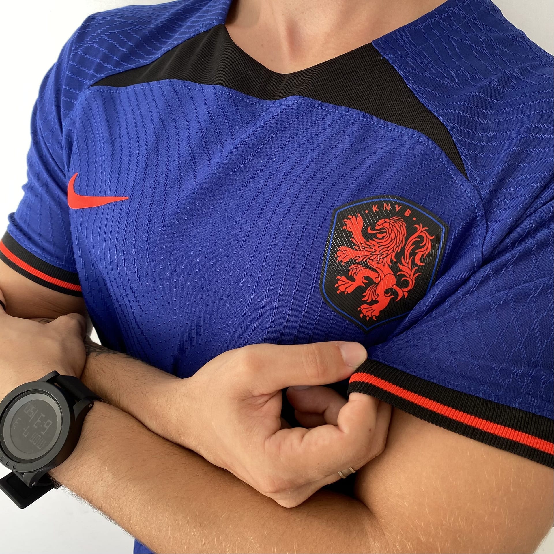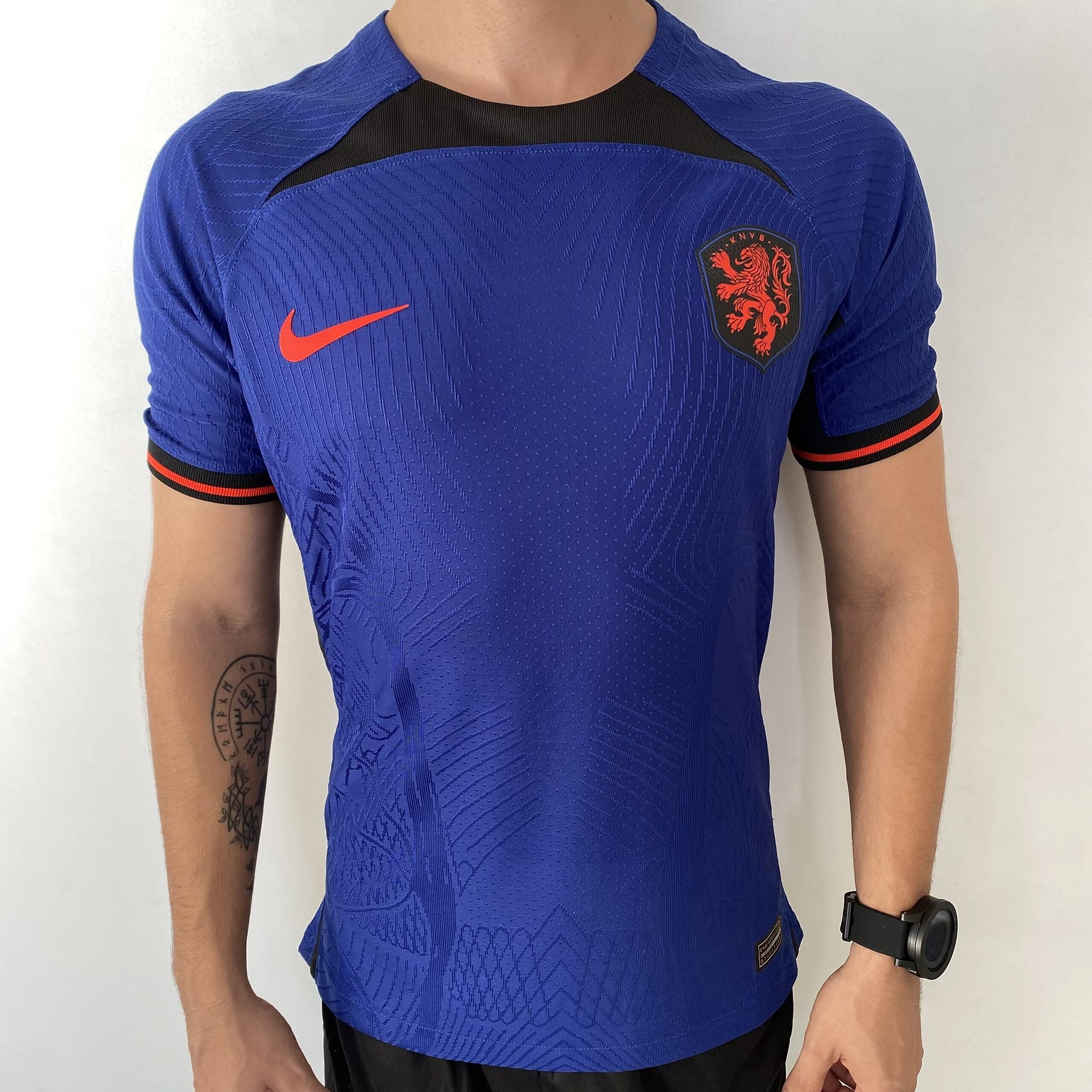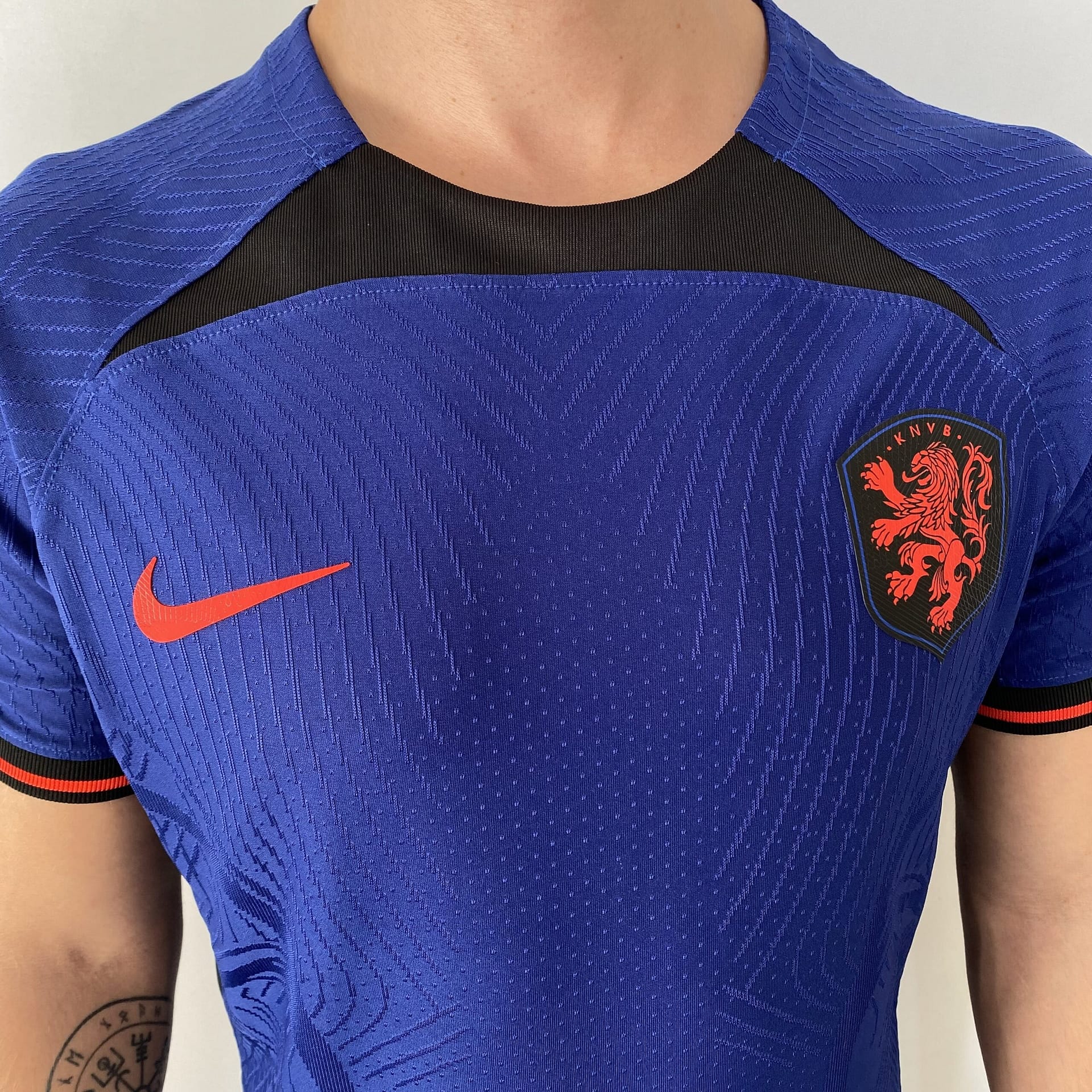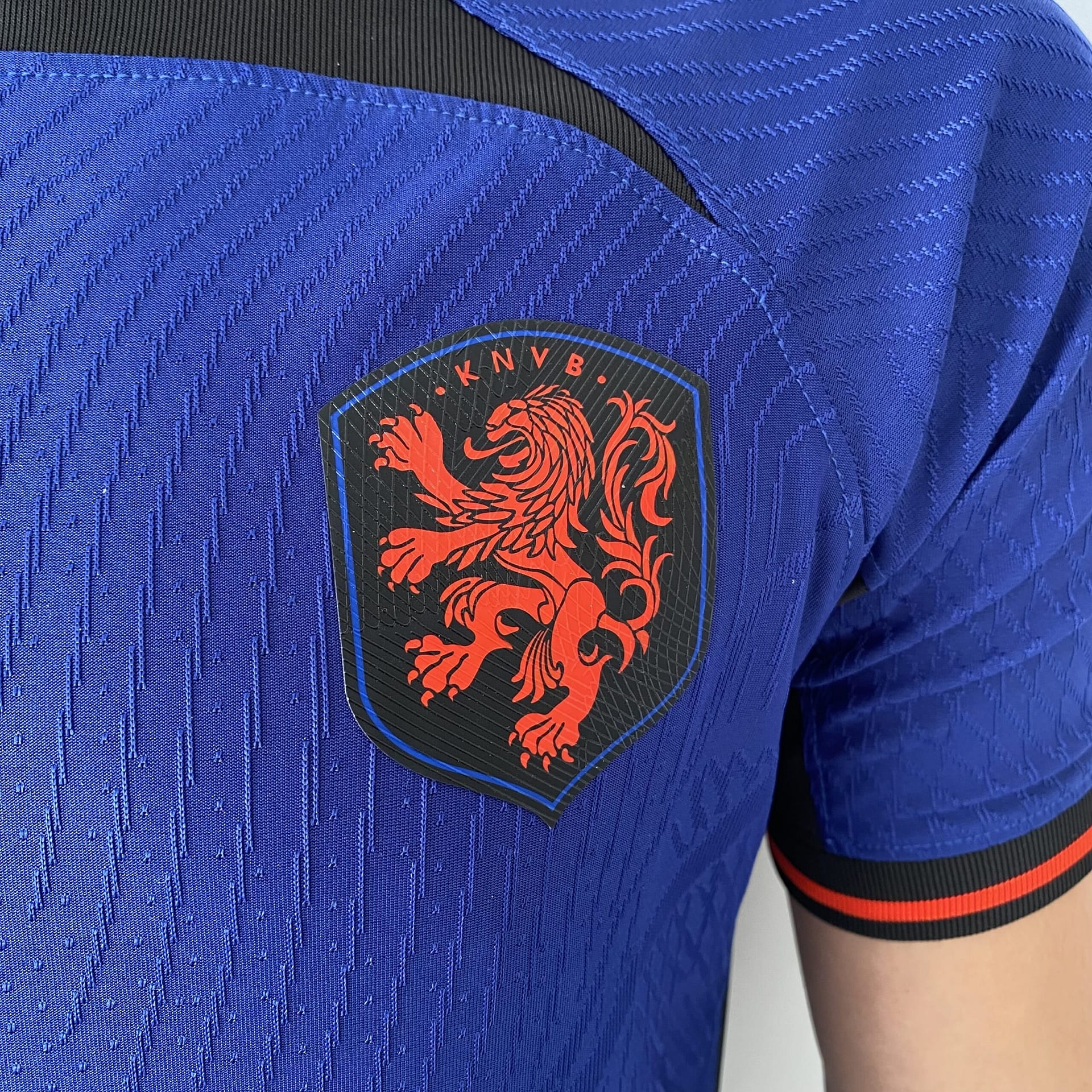 A camisa reserva da Holanda também traz o template da Nike como base, agora na cor azul escura. Detalhes pretos são vistos na parte frontal da gola, no cabide, na parte interna da nuca, bem como nas axilas e nos punhos, que trazem frisos em um tom de laranja avermelhado. O escudo da Holanda é aplicado com o leão no mesmo tom de laranja dentro de um escudo preto, já o logo da Nike ganha a mesma cor.