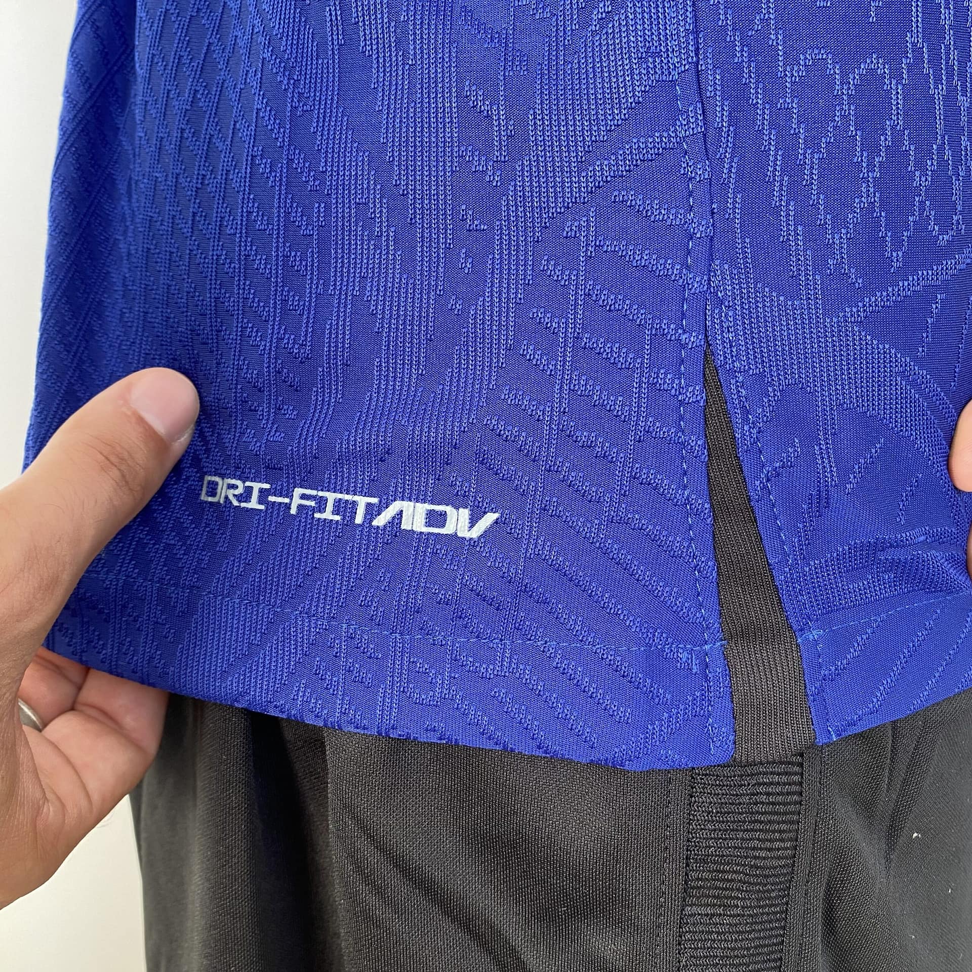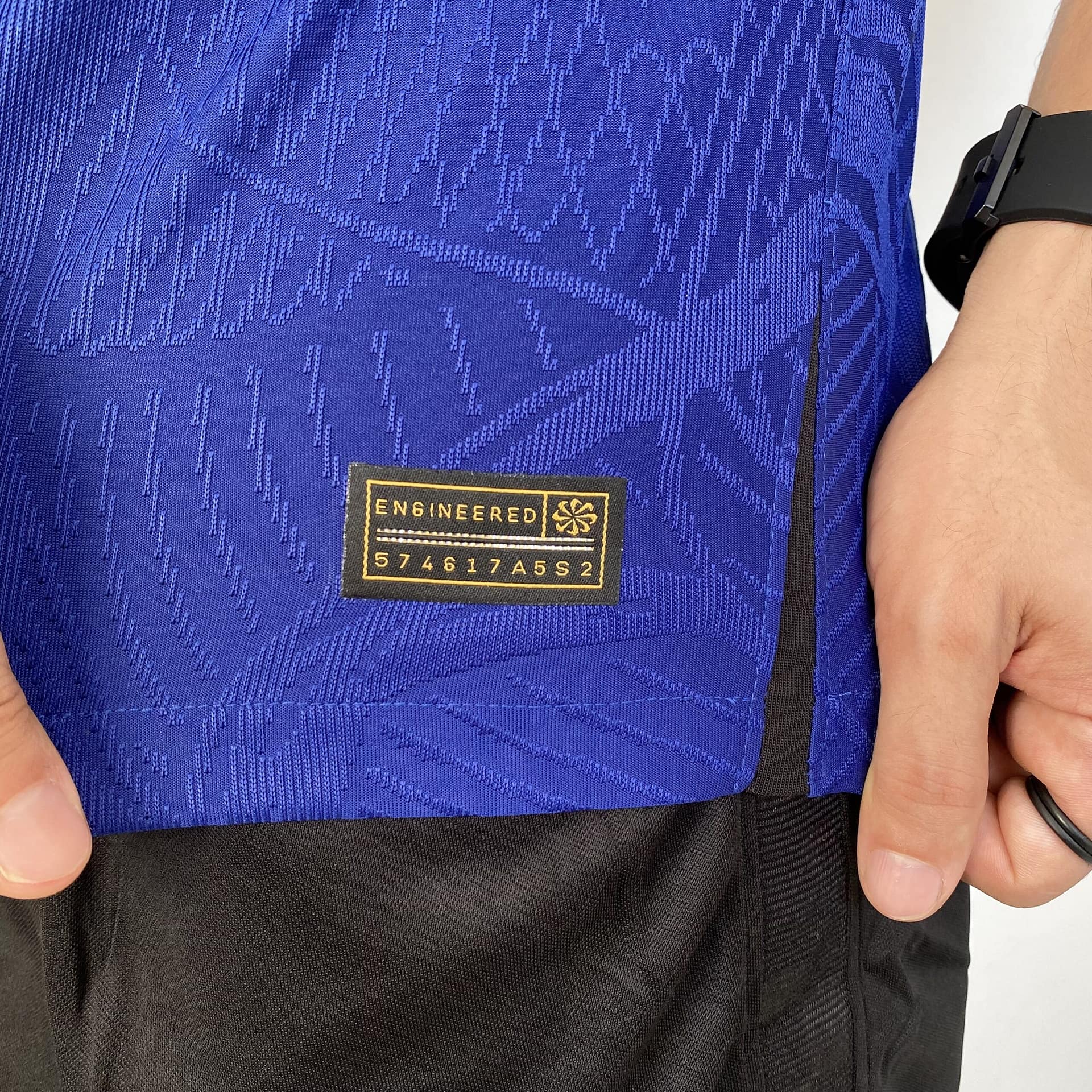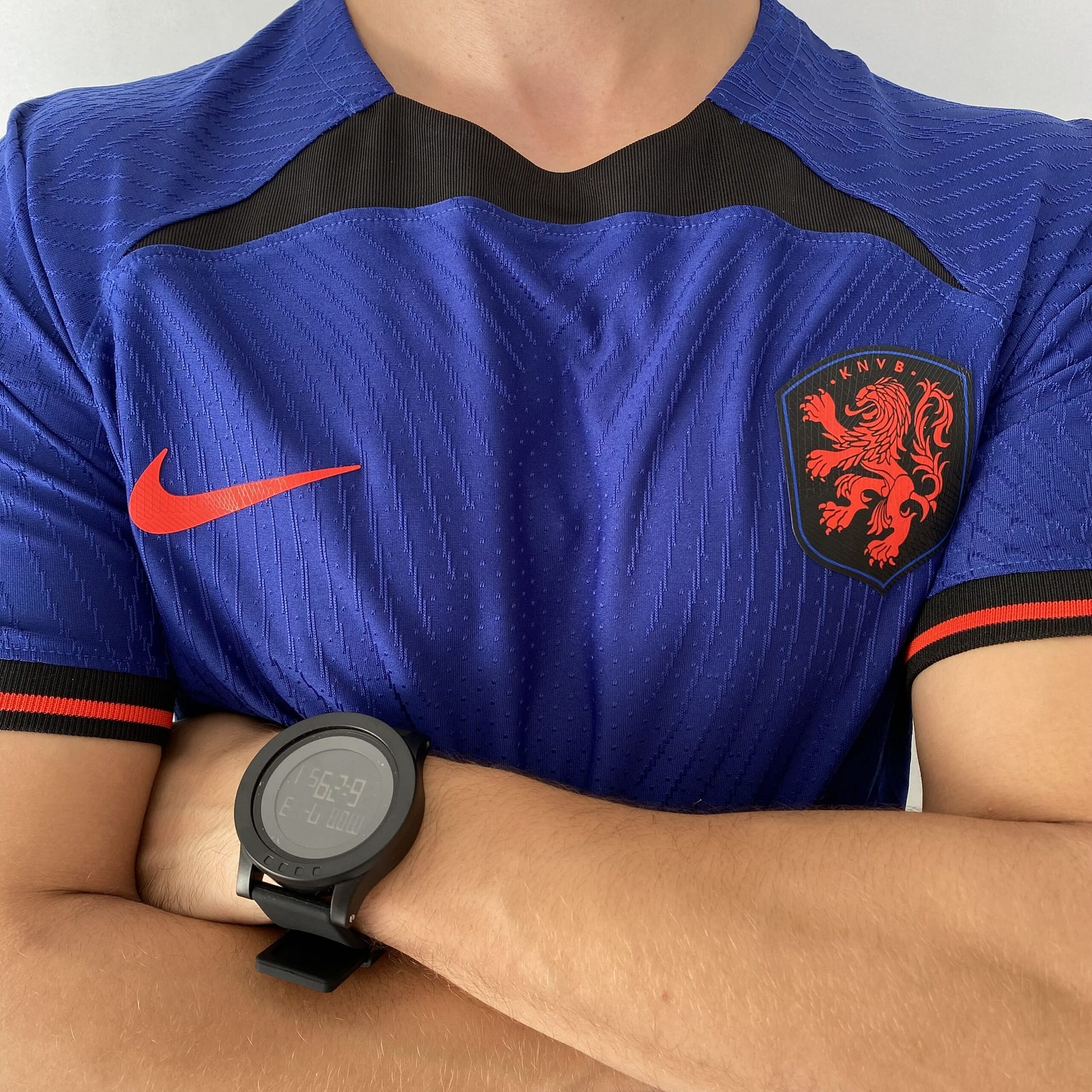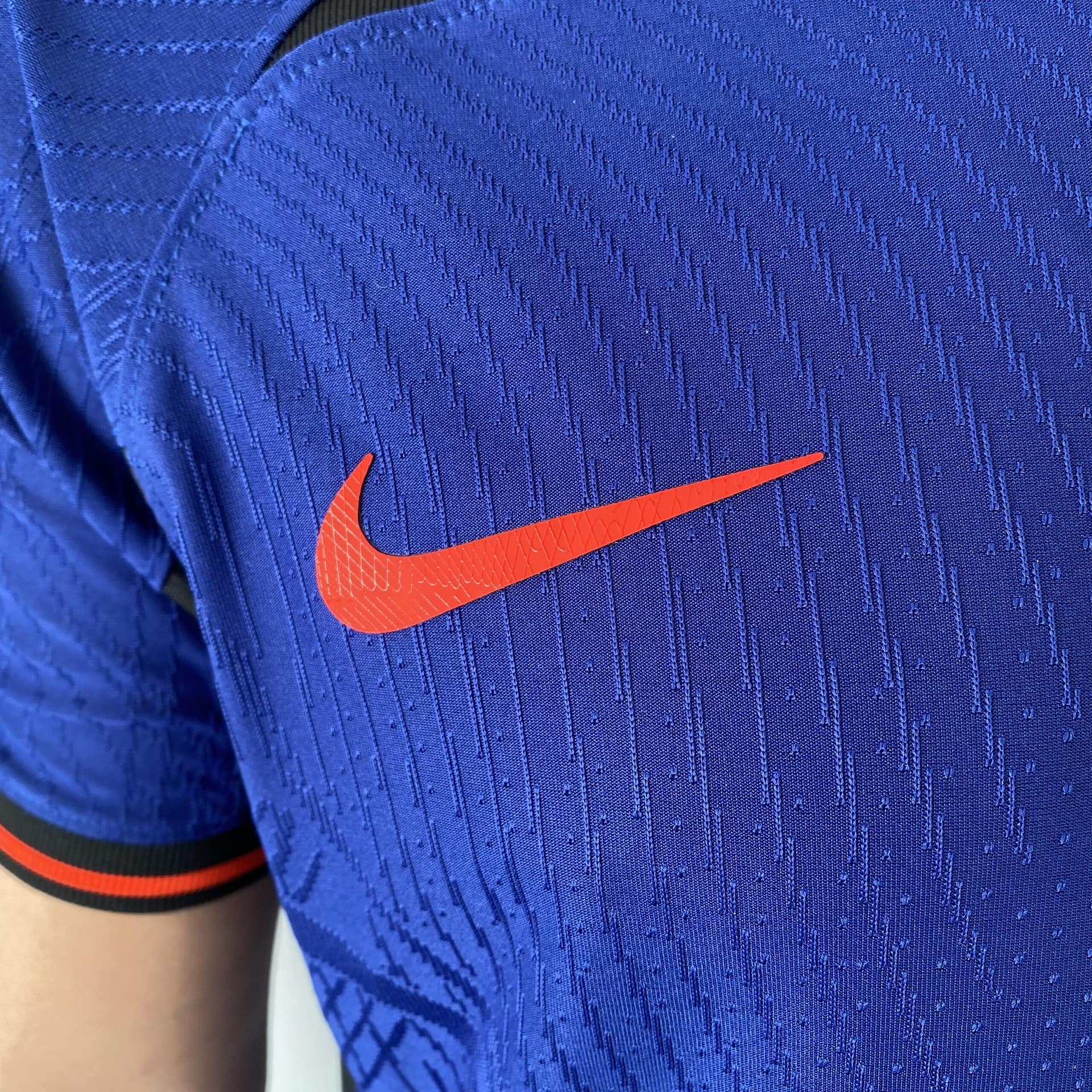 A camisa reserva da Holanda também traz o template da Nike como base, agora na cor azul escura. Detalhes pretos são vistos na parte frontal da gola, no cabide, na parte interna da nuca, bem como nas axilas e nos punhos, que trazem frisos em um tom de laranja avermelhado. O escudo da Holanda é aplicado com o leão no mesmo tom de laranja dentro de um escudo preto, já o logo da Nike ganha a mesma cor.