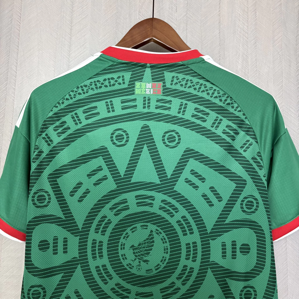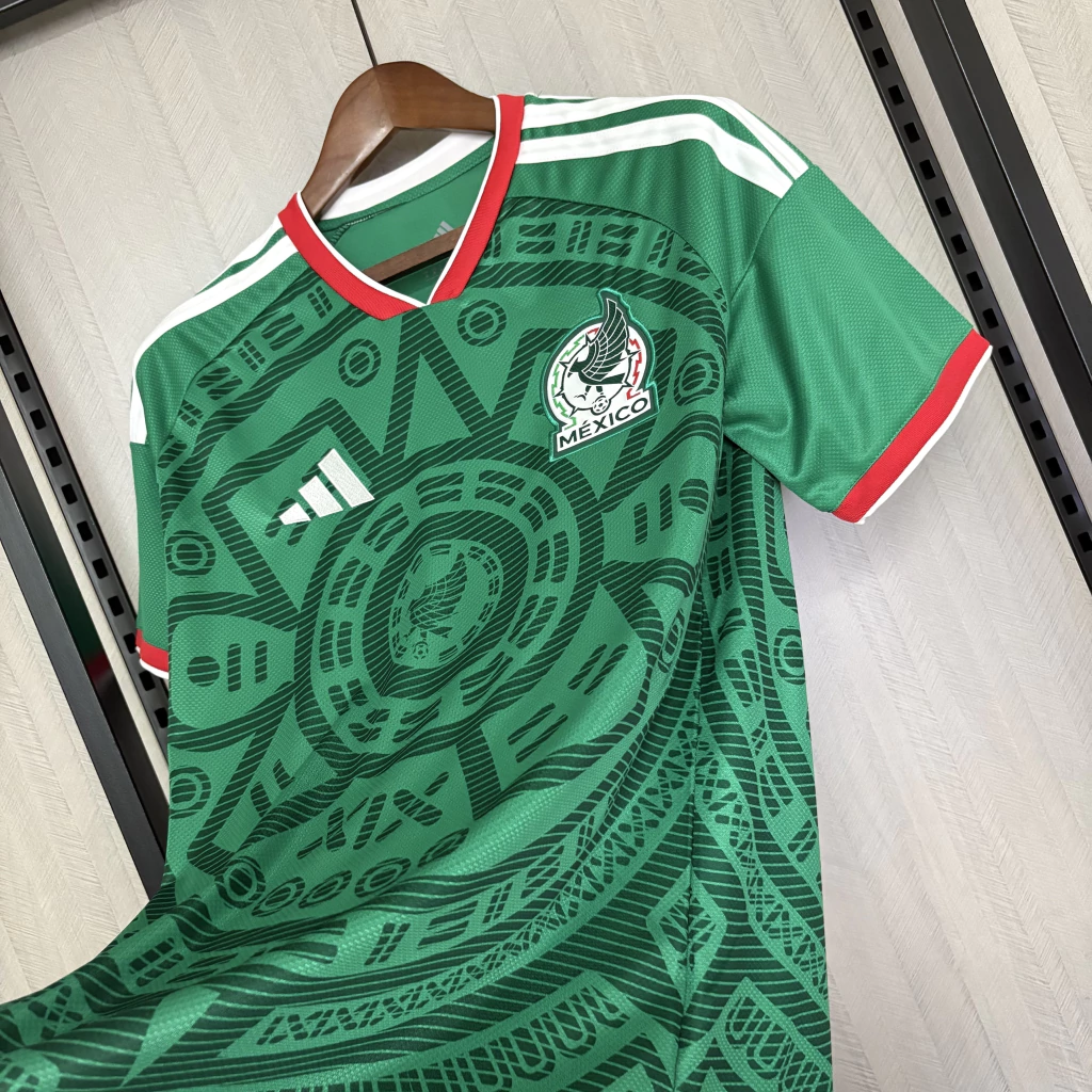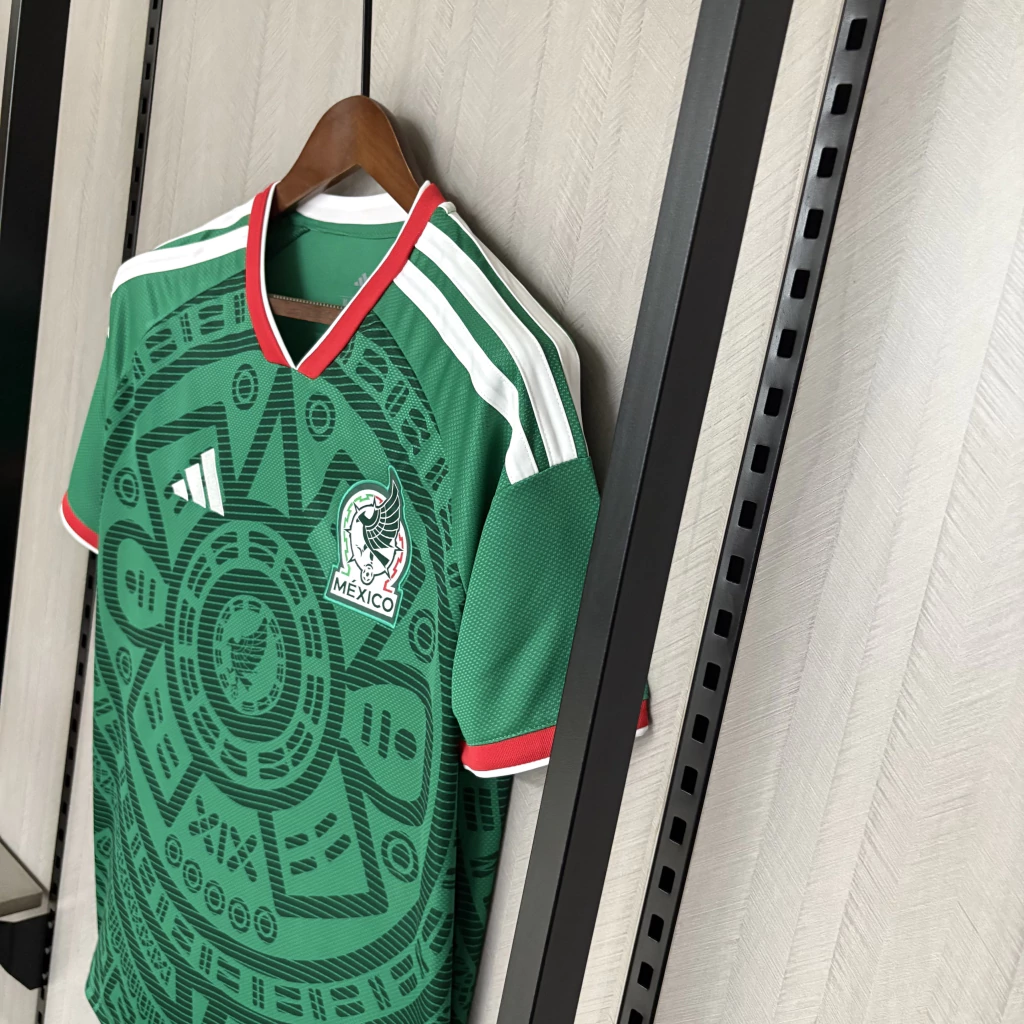 O novo uniforme titular do México une herança e futuro, simbolizando a energia e o orgulho que conectam gerações de torcedores. A peça celebra o apoio inabalável de uma nação que vive e respira futebol, onde cada jogo é um reflexo da alma e da paixão mexicana. A camisa é verde e ganha linhas verdes escuras que trazem gráficos inspirados na cultura mexicana, com referência clara o uniforme usado na Copa de 1998. A gola é V na cor vermelha com bordas brancas, padrão que é visto também nos punhos. Nos ombros as três listras aparecem em branco, no estilo mais largo, que será a marca da fornecedora no Mundial. O escudo é aplicado no lado esquerdo do peito, enquanto o logo da adidas aparece em branco, no lado direito. Um dos detalhes mais marcantes é a frase “SOMOS MÉXICO”, aplicada na parte de trás da gola. A inscrição atua como um emblema de união e identidade nacional, reforçando o espírito coletivo que define o Tri.