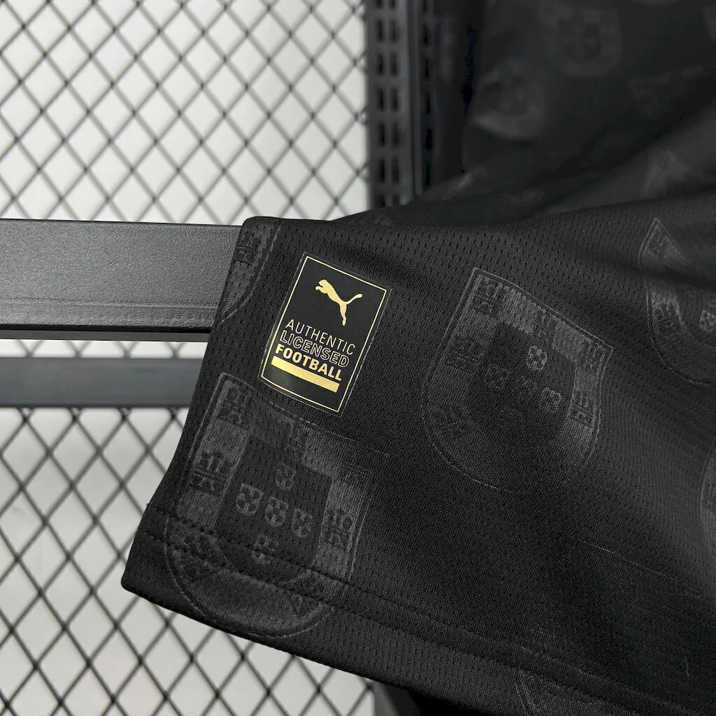 A camisa Away Portugal traz como base a cor preta e apresenta no corpo diversos brasões do país, em mosaico, num tecido brilhante. A gola tem formato pólo e é preta, com uma fina linha dourada, mesmo padrão dos punhos. O escudo da FPF é aplicado no lado esquerdo do peito, em preto e dourado, enquanto o logo da PUMA aparece em dourado, no lado direito e também nos ombros. Na nuca, a palavra “Pantera Negra” é vista em referência à um dos maiores ídolos da história do país, Eusébio, que tinha a alcunha “Pantera Negra” que é vista em dourado.