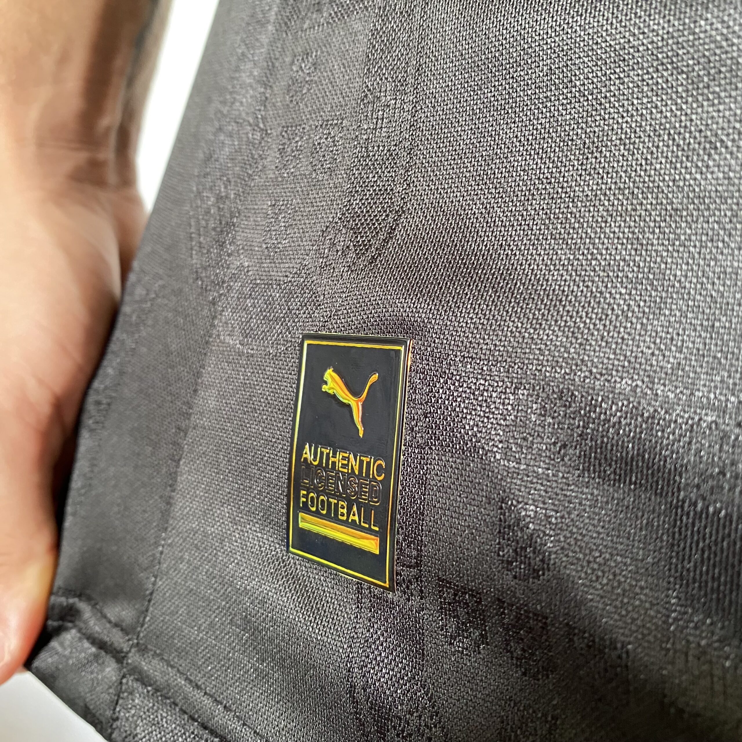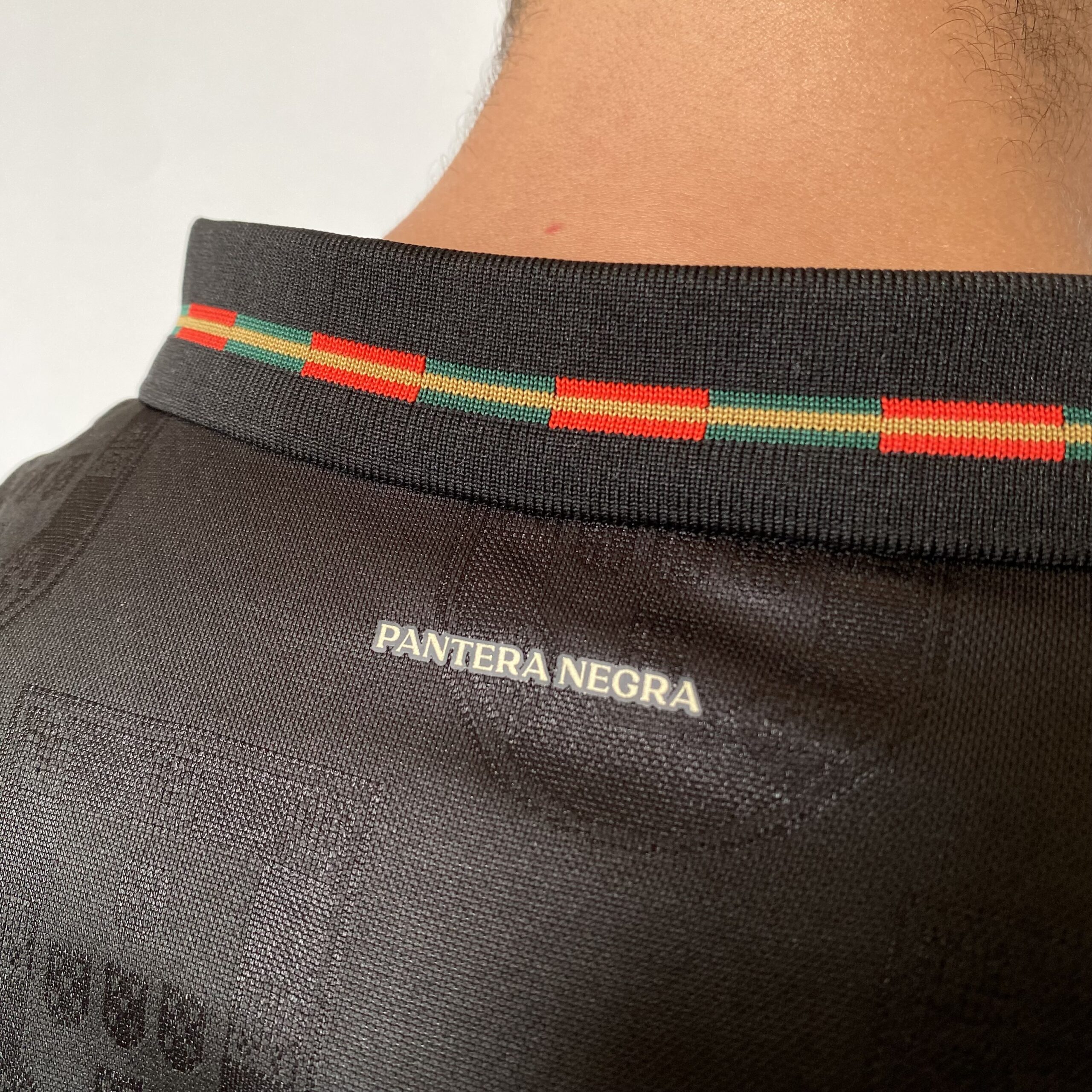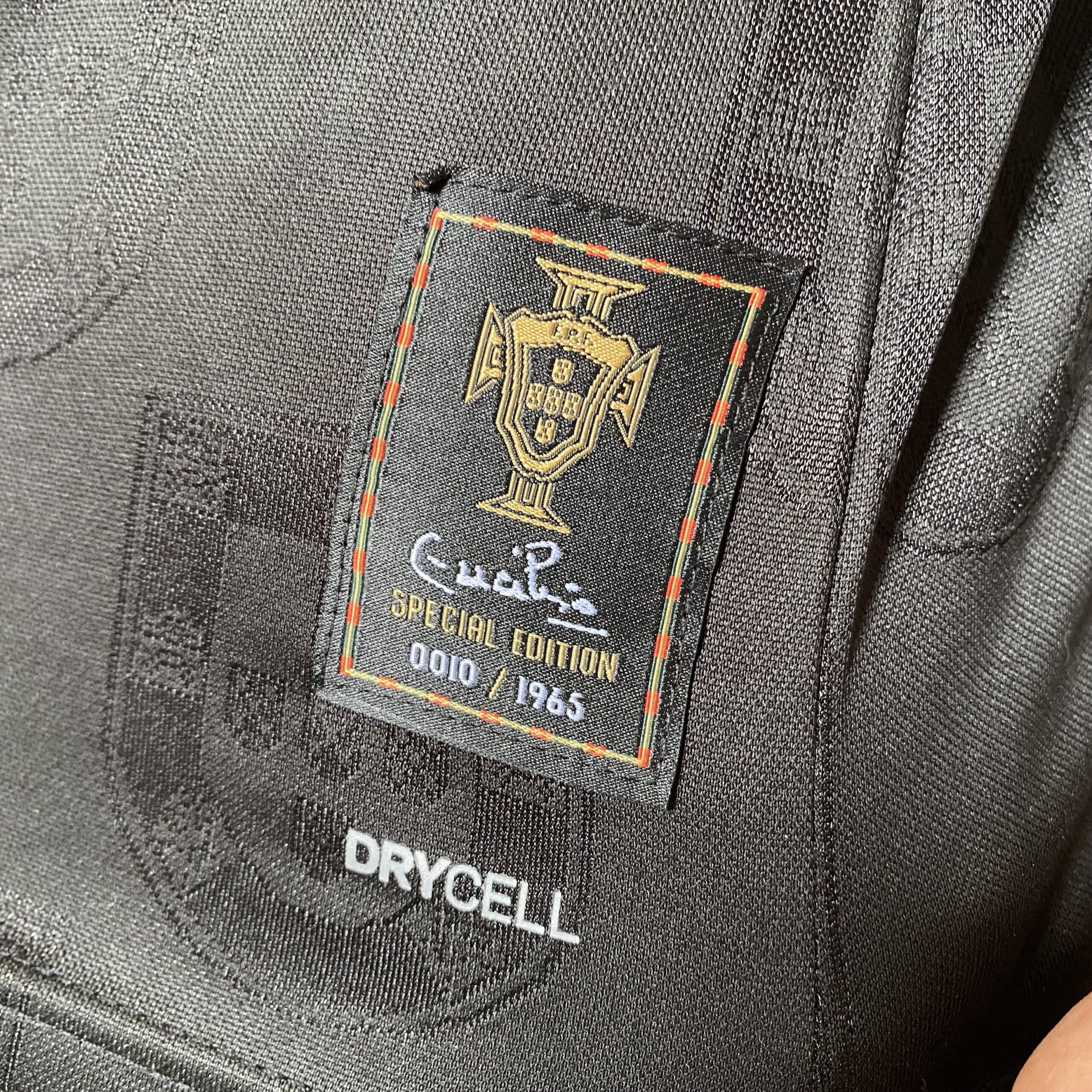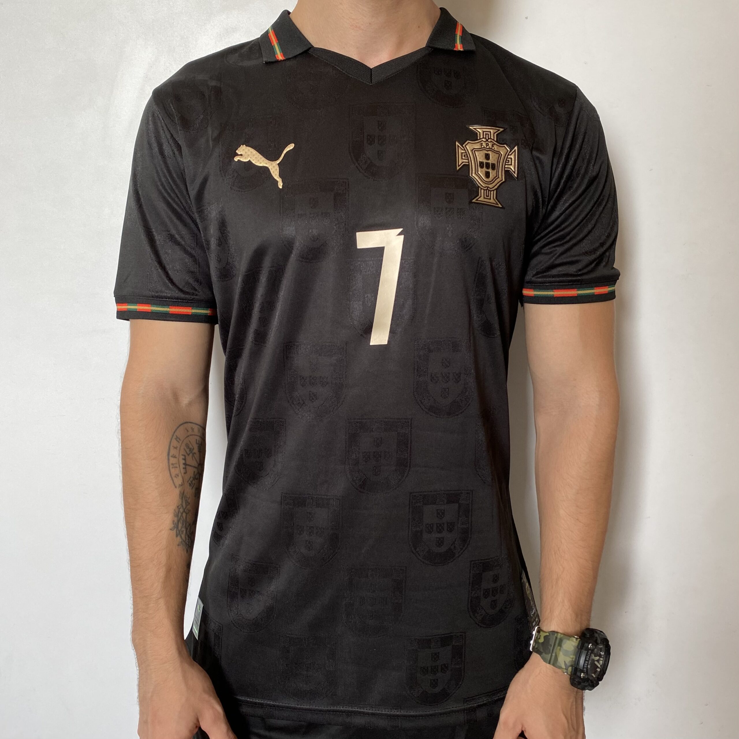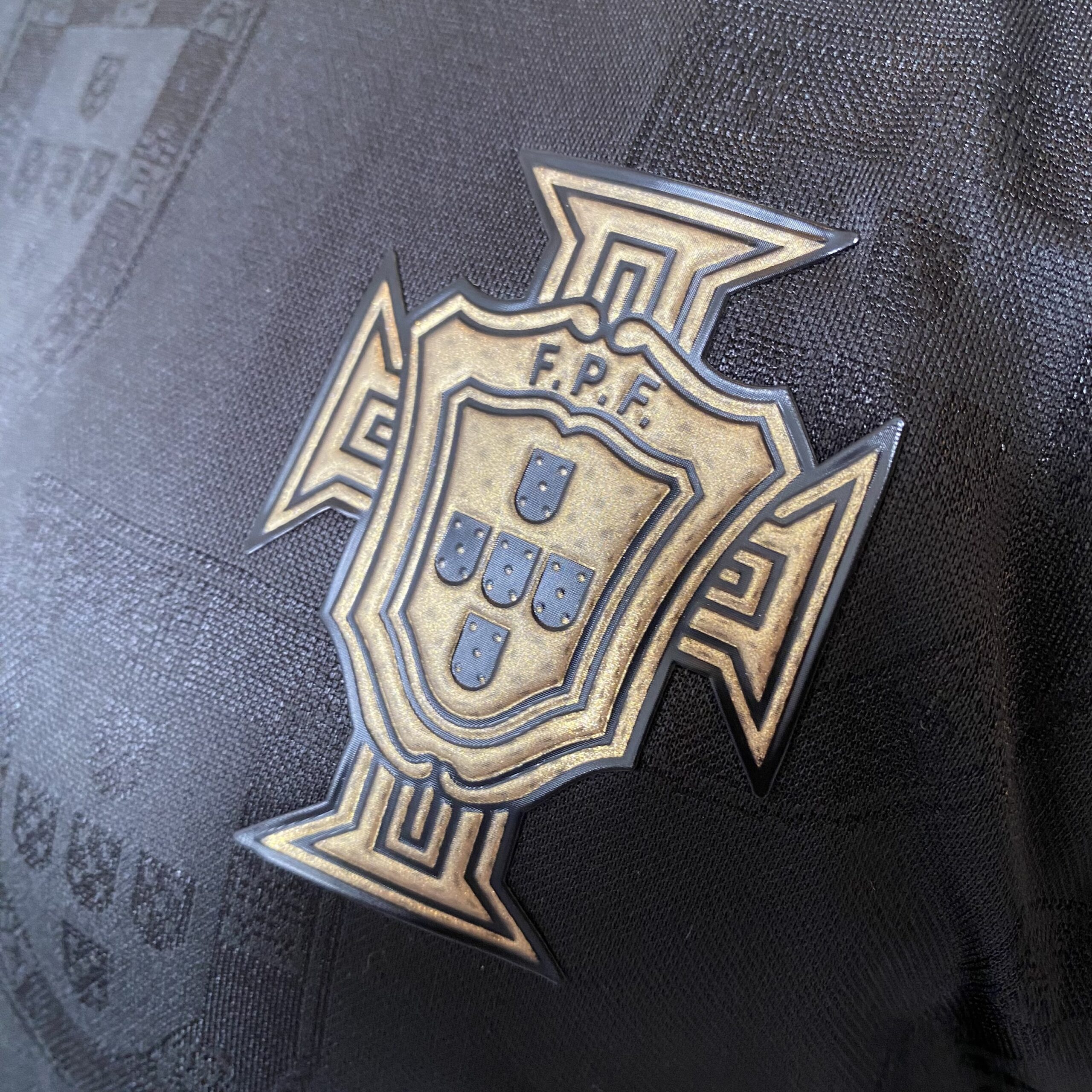 A camisa Away Portugal traz como base a cor preta e apresenta no corpo diversos brasões do país, em mosaico, num tecido brilhante. A gola tem formato pólo e é preta, com uma fina linha dourada, mesmo padrão dos punhos. O escudo da FPF é aplicado no lado esquerdo do peito, em preto e dourado, enquanto o logo da PUMA aparece em dourado, no lado direito e também nos ombros. Na nuca, a palavra “Pantera Negra” é vista em referência à um dos maiores ídolos da história do país, Eusébio, que tinha a alcunha “Pantera Negra” que é vista em dourado.