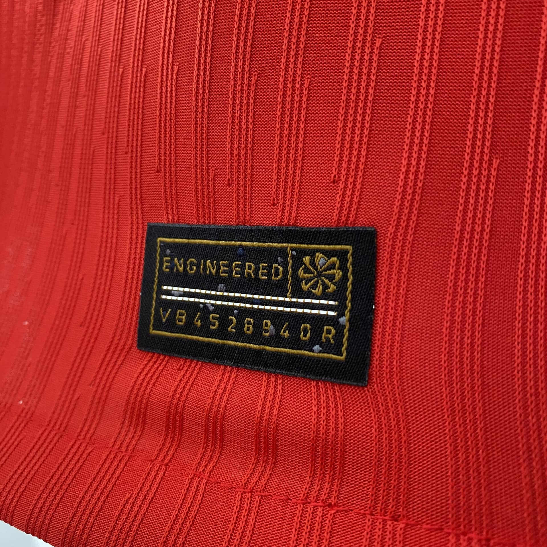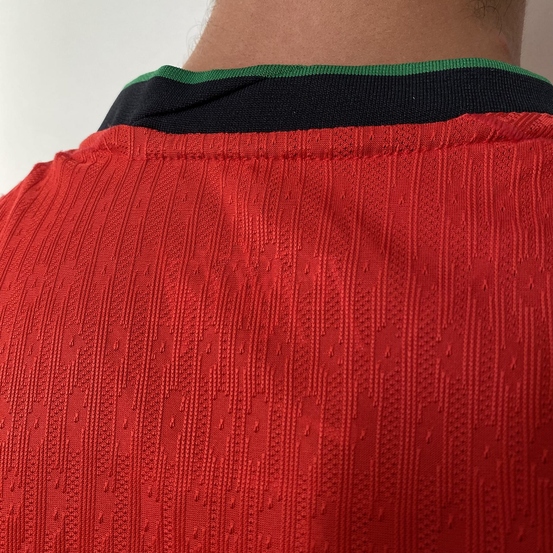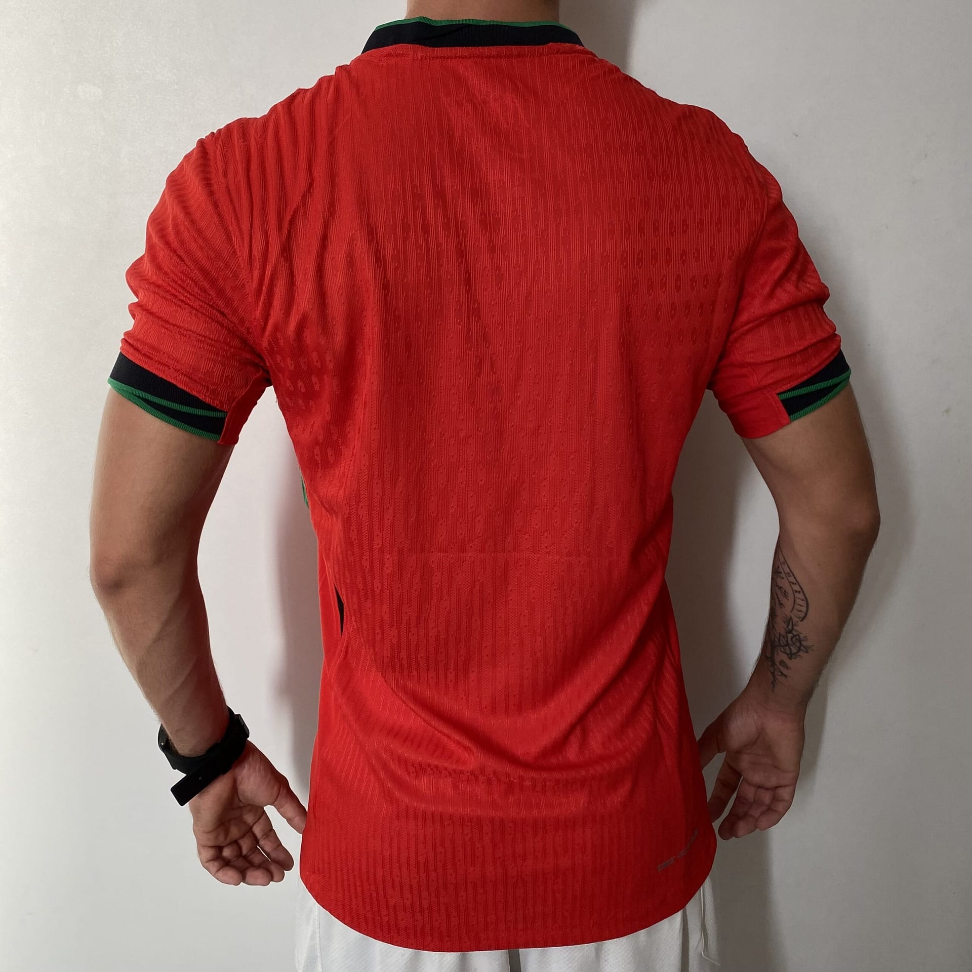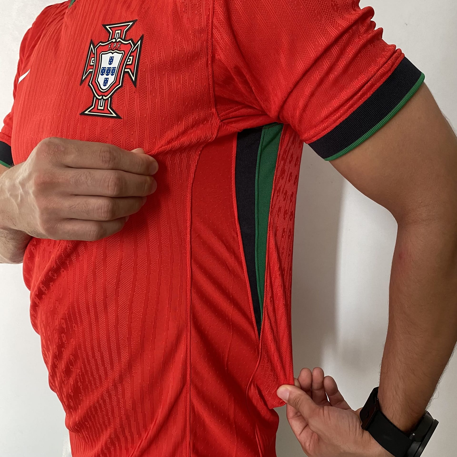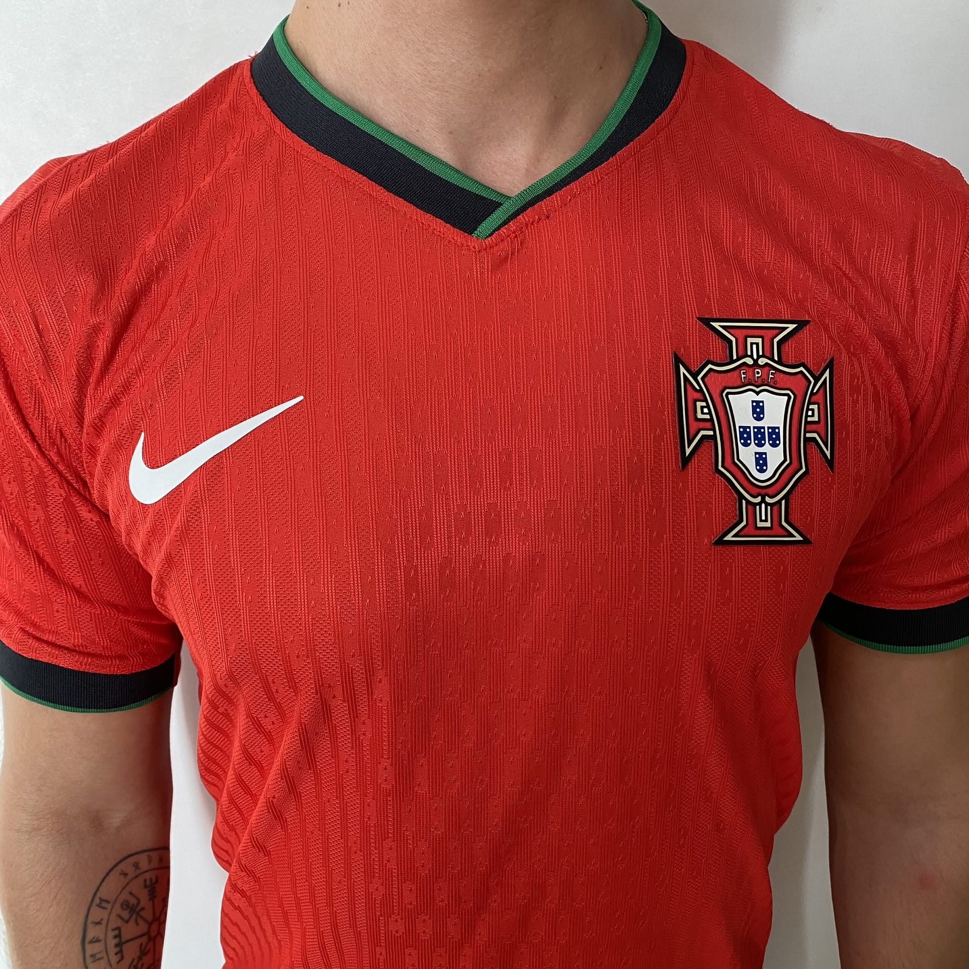 A nova camisa titular de Portugal para a temporada presta homenagem à bandeira portuguesa e à criatividade cultural do país, que inspira a forte história do futebol português. Predominantemente vermelha, como tradicional, ela traz como destaque a nova gola da marca, em preto, com contorno verde, mesmo padrão visto nos punhos. No interior da gola, é escrito “Portugal”, numa fonte elegante que liga a orgulhosa herança do emblema da seleção a um futuro emocionante partilhado por atletas e fãs. A Nike estampa o Swoosh em branco, no lado direito do peito, enquanto o logo da Federação Portuguesa é colocado no lado esquerdo, em sua versão padrão.