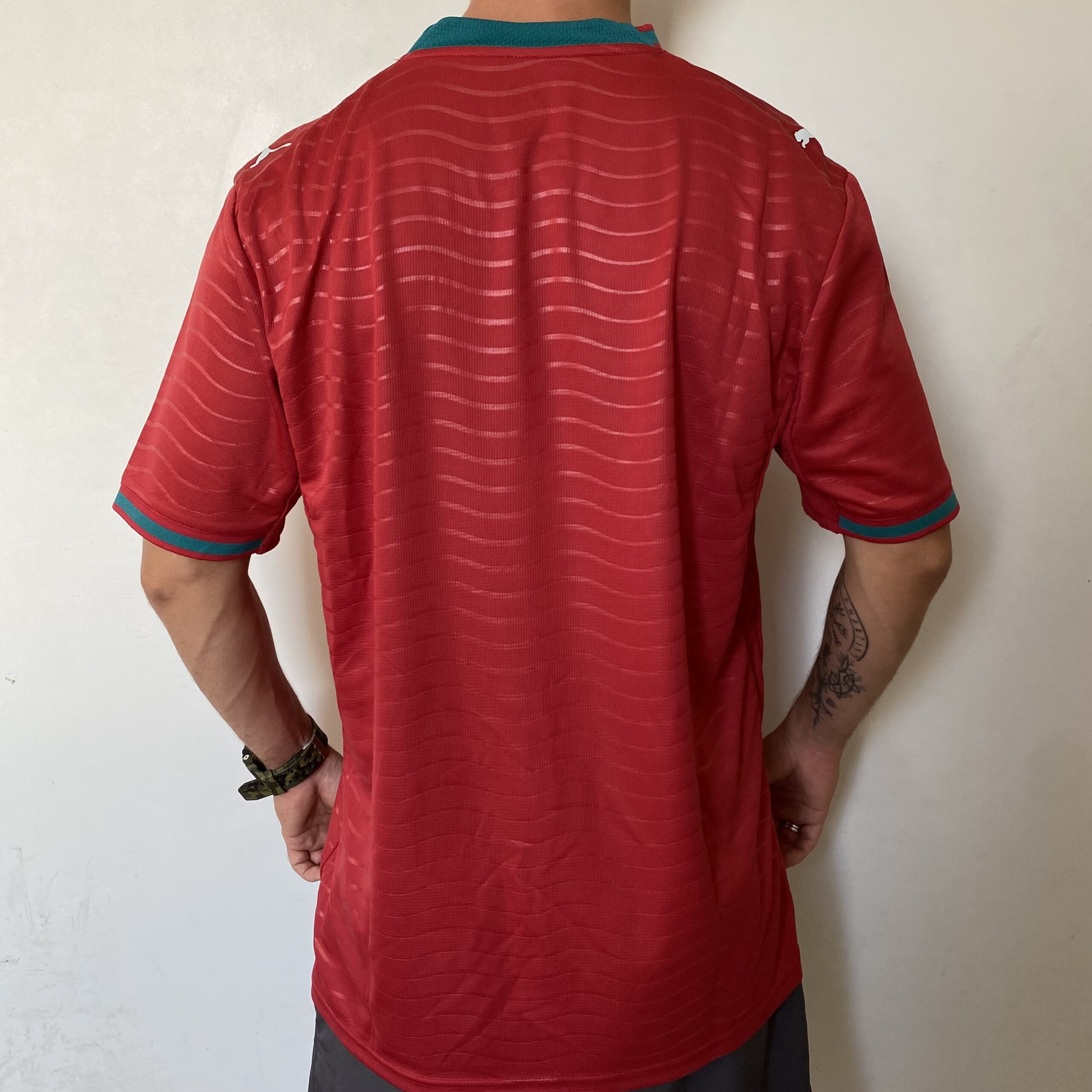 A nova camisa titular de Portugal traz como base um vermelho encarnado e ganha ao longo de todo o corpo, um padrão ondulado em jacquard, que dá movimento à peça. A gola traz um estilo “Y” em vermelho, com um detalhe em V na cor verde, cores que se repetem também nos punhos. O escudo da FPF é aplicado no lado esquerdo do peito, enquanto o logo da PUMA aparece em branco, no lado direito e também nos ombros. Dentro da gola, é visto uma rosa dos ventos, que deve fazer referência às famosas navegações portuguesas, que desbravaram diversos novos continentes.