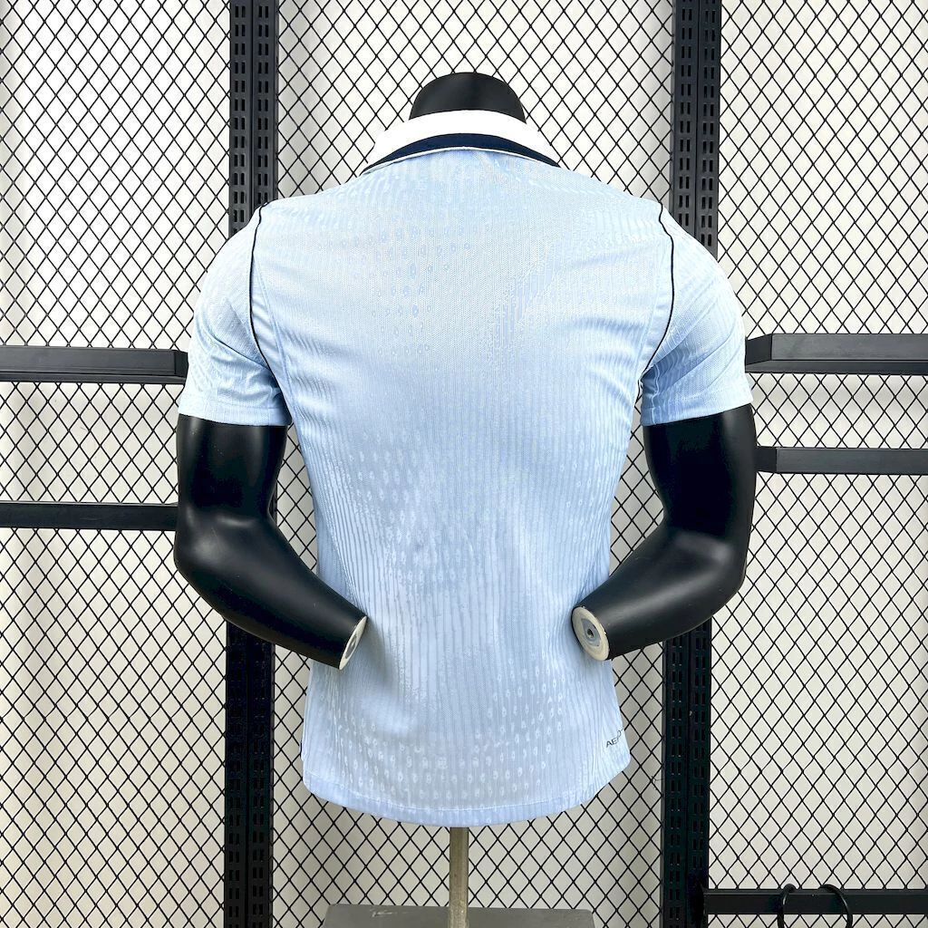 A nova camisa titular do Uruguai trará o template padrão da marca para a temporada 2026-2027, que será visto também nas camisas do Brasil e do Corinthians; Ela é, como tradicional, azul celeste, e traz as linhas que ligam os ombros até a barra da camisa pelas laterais, passando pelas escápulas, em preto. A gola tem formato pólo e é branca, com a parte de trás trazendo o preto. No interior, vai um selo especial com a frase “Uruguay Noma” (abreviação de Uruguay y nada más), grito de guerra feito por jogadores e torcedores em Copas do Mundo. A Nike estampa o Swoosh em preto no lado direito do peito, enquanto o escudo da Associación Uruguaya de Fútbol vai no lado esquerdo, em branco e dourado, com as quatro estrelas acima, na mesma cor.